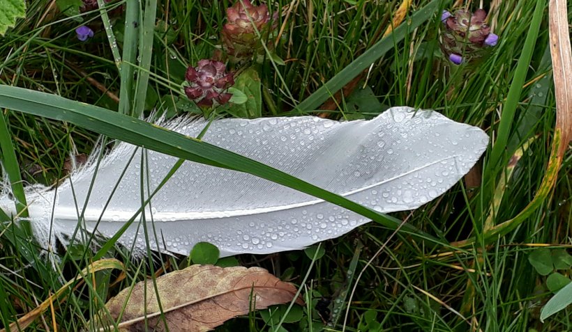 I love the way the dew is beading on the feather, the way it’s nestled between the blades of grass, fallen leaf and flowers.